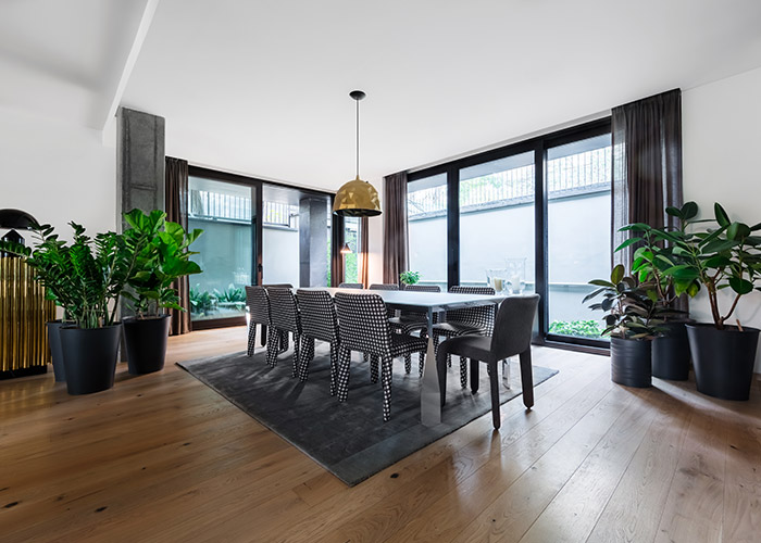 Micro-cement is used to cover the floor in the sitting and dining areas as well as in the kitchen and hallways; its mild tone helped to create a zen-like mood, while the original wooden floor is then re-introduced in the bedrooms to both bring back the charm of the original design and to create a warmer feel for the most intimate parts of the apartment.